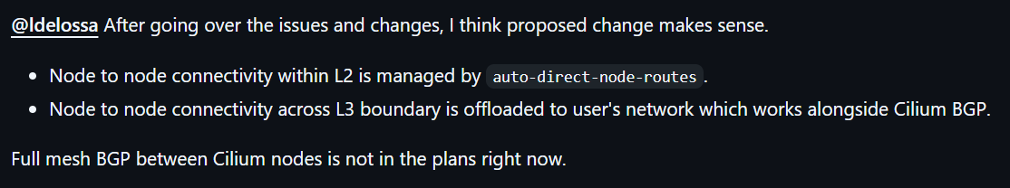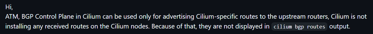 이번 실습에는 Cilium에서 --set bgpControlPlane.enabled=true를 사용하여 Cilium에서 BPG 연동이 가능하도록 구성하였습니다. 이를 아래와 같이 확인할 수 있습니다.