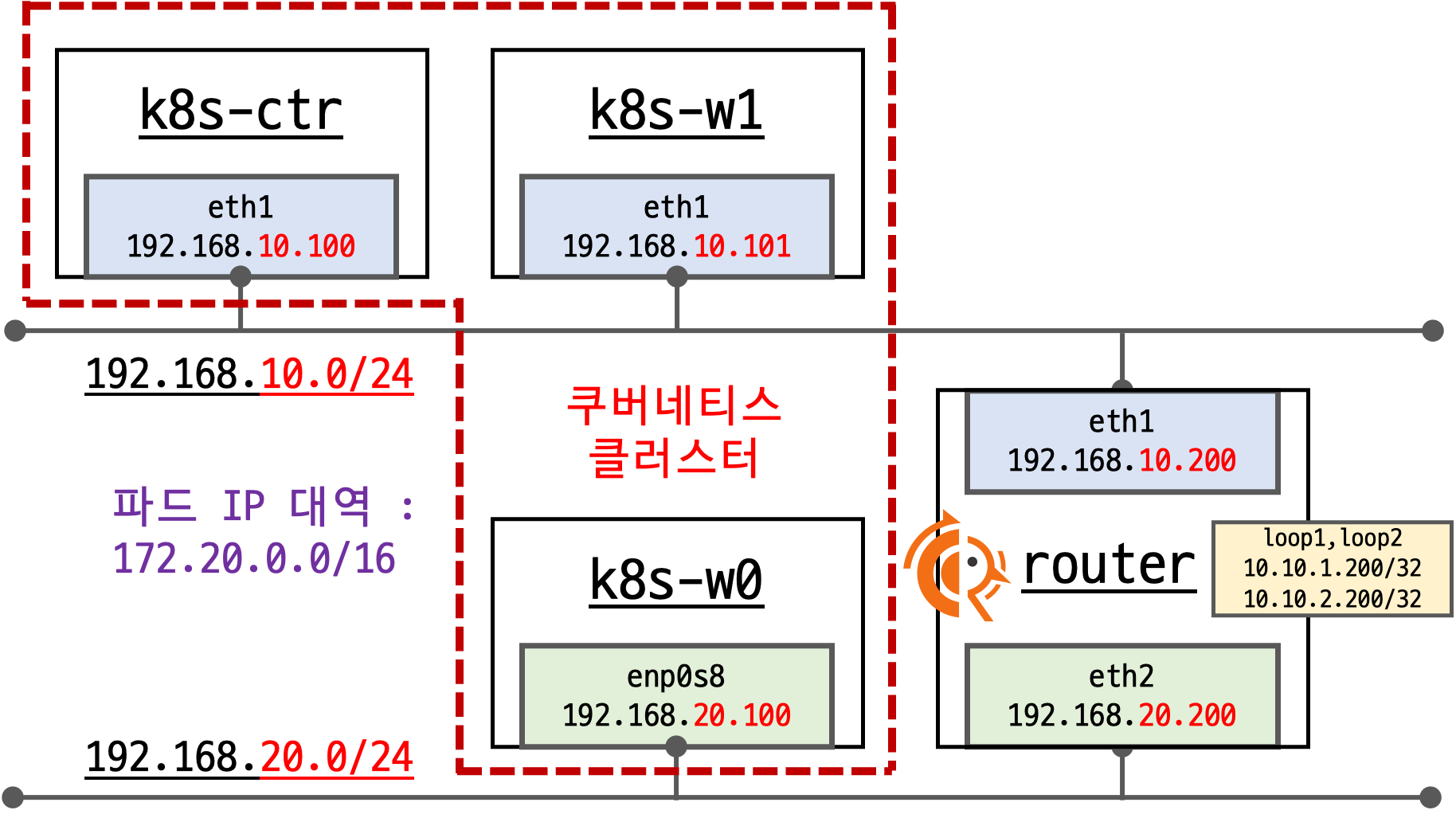 해당 실습 환경에서는 서로 다른 네트워크에 워커노드를 위치하고, router라는 VM을 통해서 서로 연결되도록 구성되어 있습니다. 각 네트워크에 위치한 VM들은 상태 네트워크에 대해서 라우팅을 router를 통해 처리하도록 static route가 적용되어 있습니다.